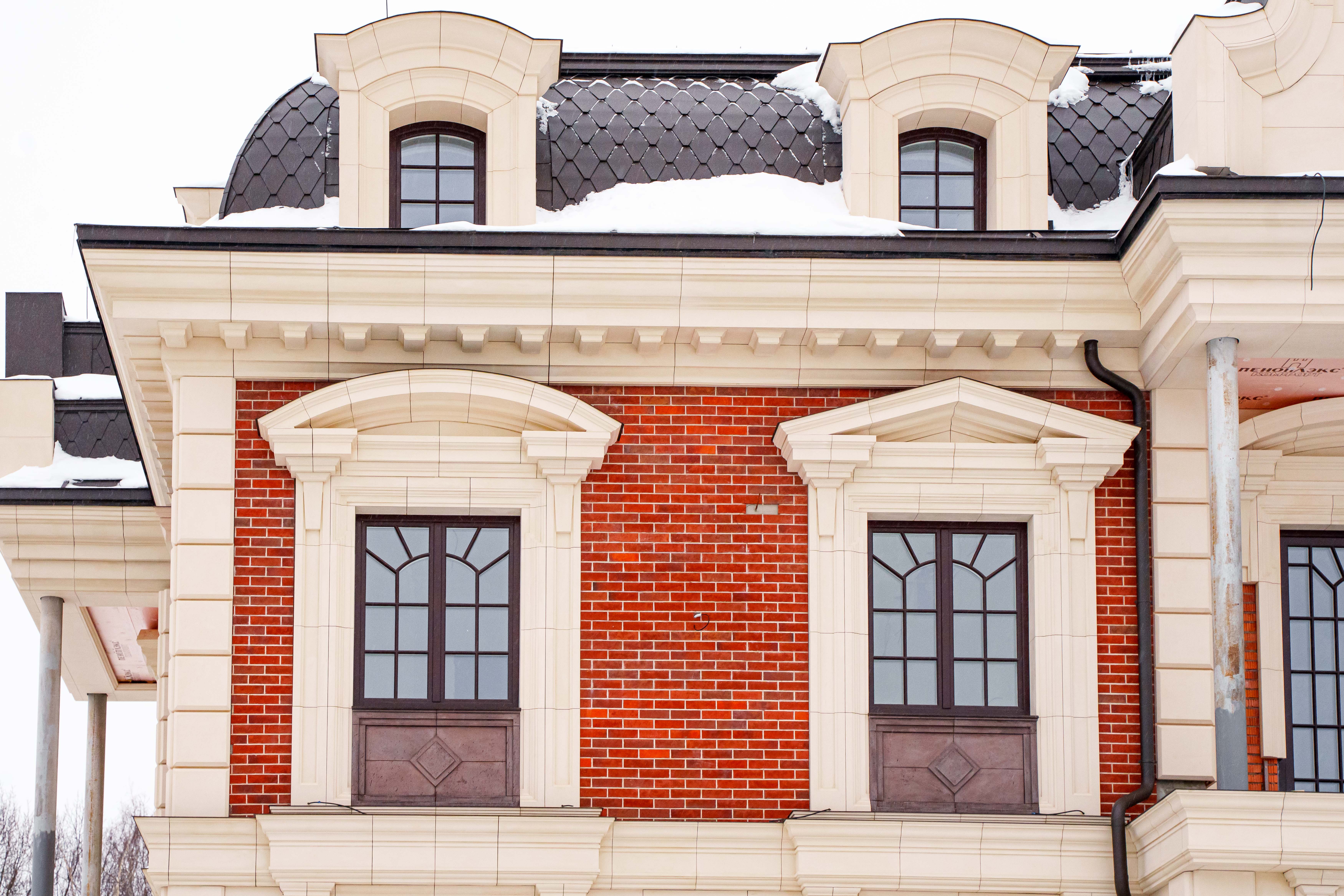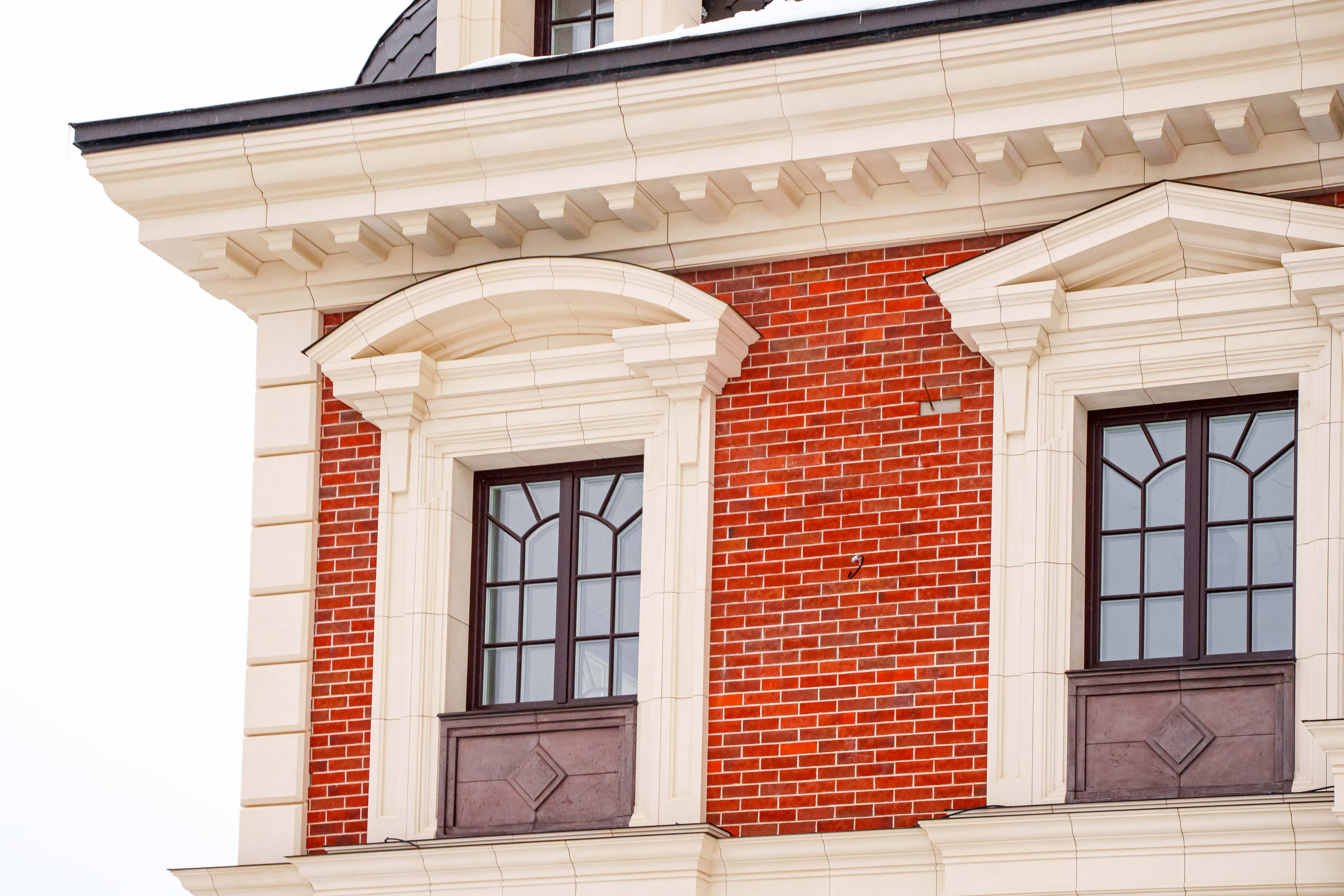 Были изготовлены крупные архитектурные элементы в виде колонн, пилястр и широких карнизов, а также рустовая кладка по всему первому этажу здания.