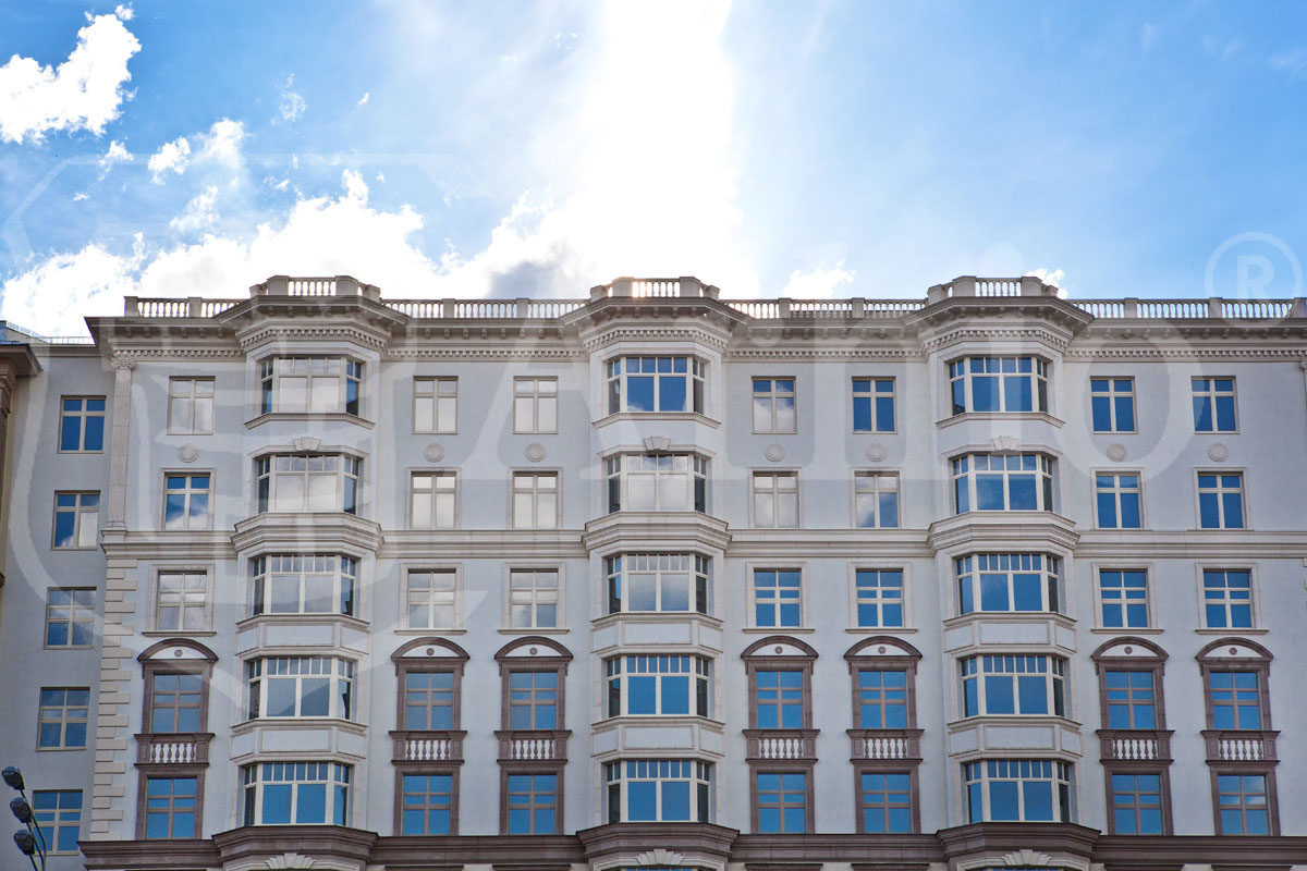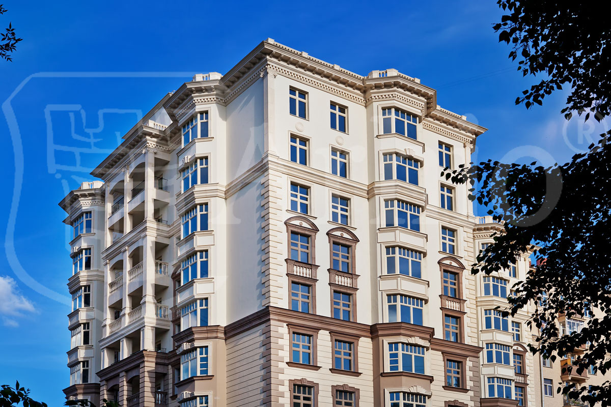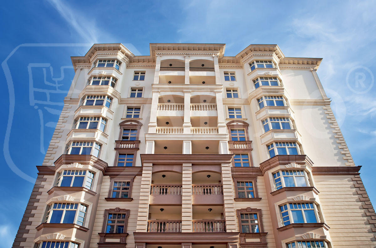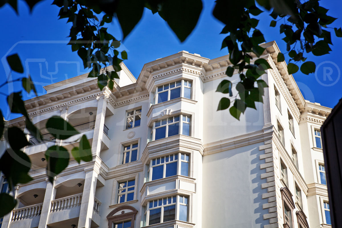 Современный жилой комплекс в классическом стиле. В соответствии с архитектурным проектом были разработаны нестандартные элементы фасадного декора с уникальной системой крепления.